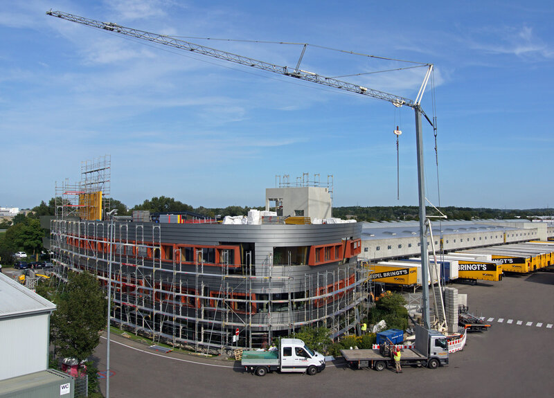 Mehr Platz für Noerpel in Ulm: Das zweigeschossige Zentralgebäude wächst aktuell um einen 770 Quadratmeter großen Aufbau. Damit vergrößert das Unter-nehmen an der Ulmer Ernst-Abbe-Straße seine Büroflächen um zirka 20 Prozent.